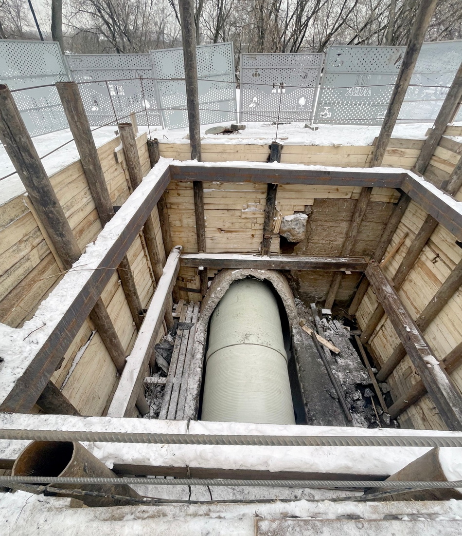 При проведении работ применялась бестраншейная технология «труба в трубе», которая заключается в прокладке новой трубы меньшего диаметра внутрь существующей.