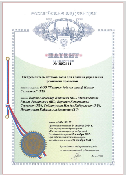 Специалисты ООО «Газпром добыча шельф Южно-Сахалинск» разработали и запатентовали новую конструкцию распределителя потоков воды.
